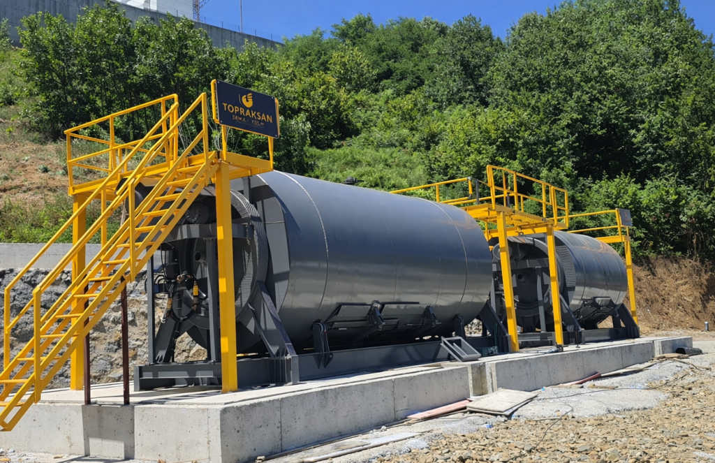 • Güçlü Tahrik Sistemi: 2 adet 18,5 kW motor ve Planet 1136 redüktör (dişli kutusu) ile desteklenen tahrik ünitesi, entegre motor freni ile güvenli duruş sağlar. Prosesin doğasına uygun olarak optimize edilmiş 3-5 dev/dk dönüş hızı sunar.